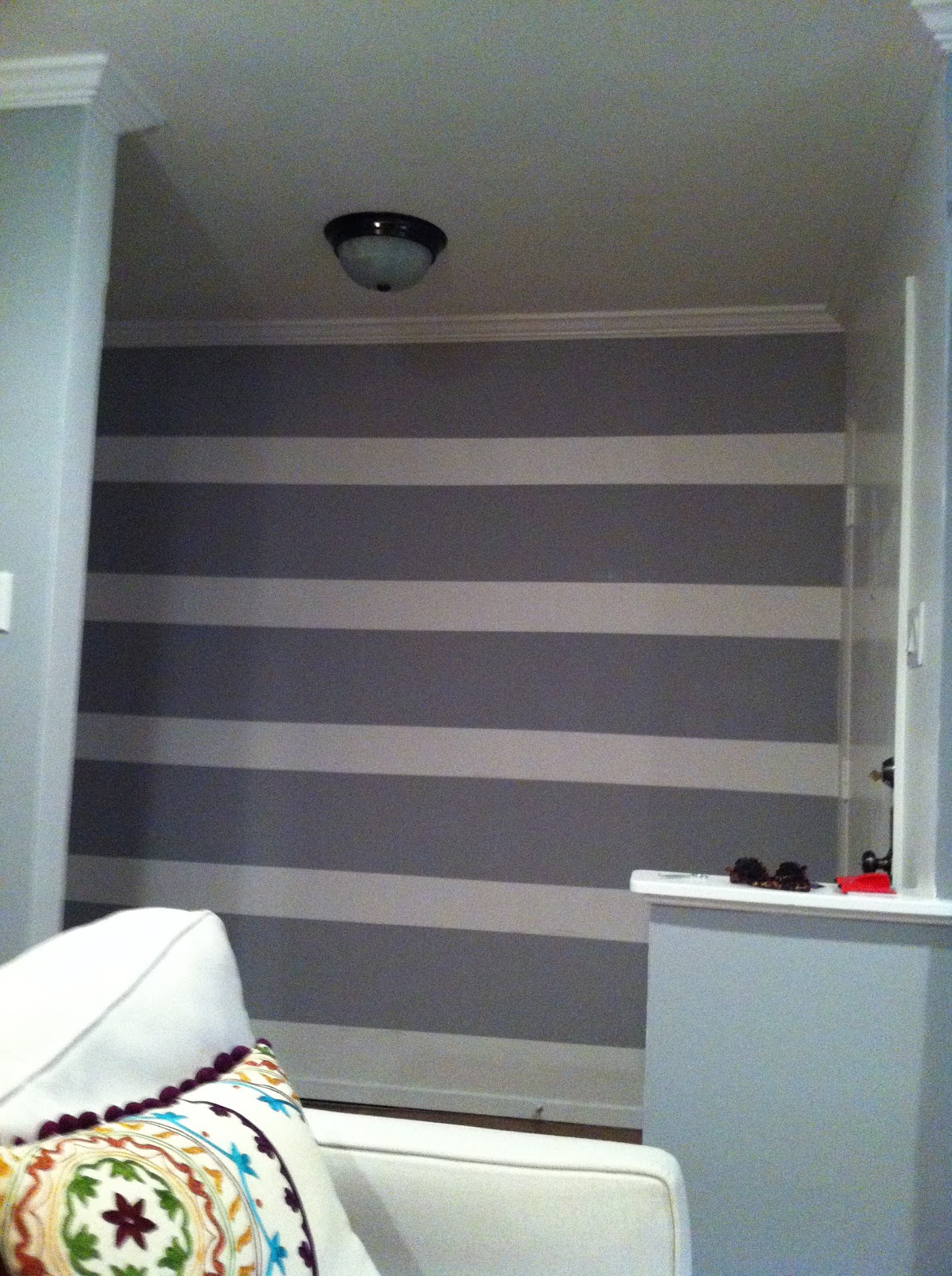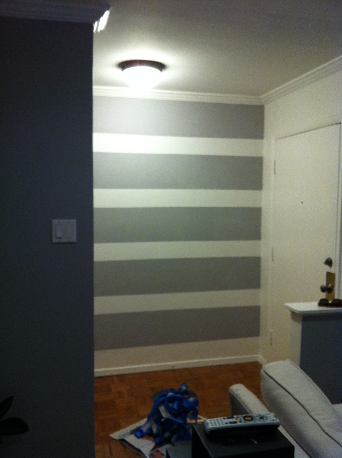 Finally with some time on my hands, I measured and taped off my stripes. The big area is 12" and the small stripe is 6". (BIG Thanks to my mom and Ross for correcting a few slanted lines)